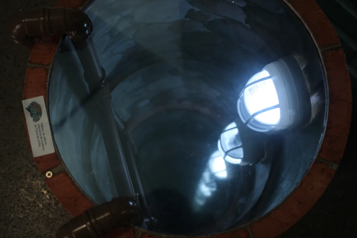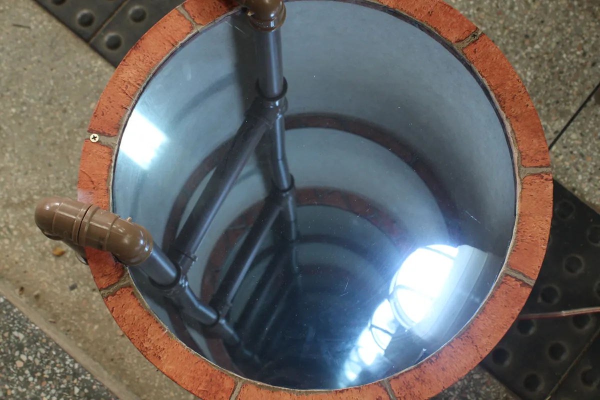 Ao observar o interior através do semi-espelho, podemos notar a replicação das imagens, criando a sensação de profundidade. O espelho no fundo reflete a imagem do interior para cima, que é parcialmente refletida de volta pelo semi-espelho. Esse processo se repete diversas vezes, e cada nova reflexão produz uma imagem um pouco mais fraca, resultando na ilusão de um túnel luminoso que parece não ter fim.